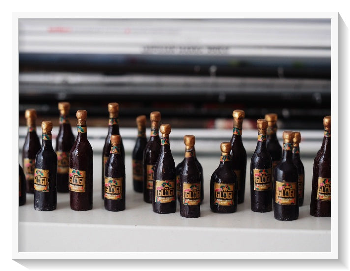 Pullollinen glögiä. Pullon korkeus 3-3,5 cm. Pullot ovat muotoiltu fimosta ja jokainen muodoltaan erilainen.