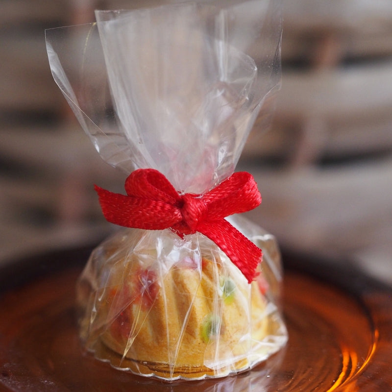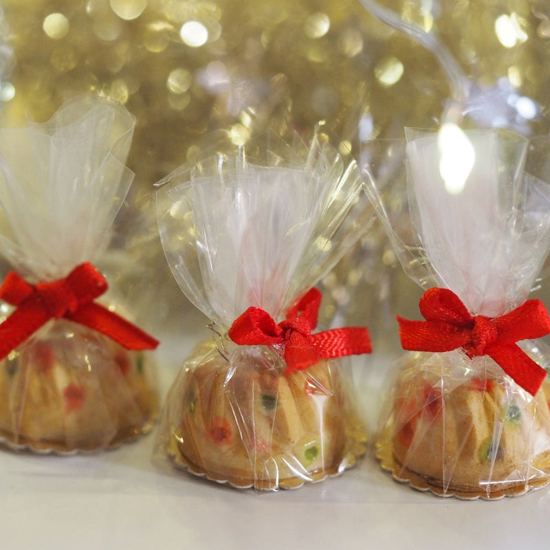 Jouluinen hedelmäkakku sellofaanissa. Alustan halkaisija 2,5 cm.
